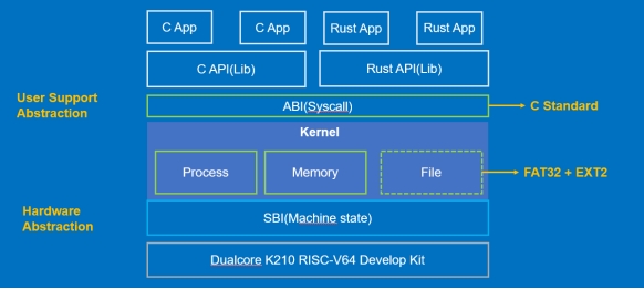 内核不仅需要实现其中断服务机制,还需要同步服务机制,也就是系统调用,系统调用组成的接口称作ABI,我们所构建的ABI满足C语言规定调用标准,为用户提供用户服务抽象。但是直接裸露的ABI不便于用户使用,因此我们还构建了用户标准库。同时,为了支持C语言和Rust语言的编写,我们同时加入了C语言和Rust语言的标准库,意味着,我们原生支持跨语言程序编写和运行。