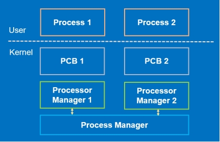 我们将进程的管理分为四个层次:进程、进程控制块、核调度器、进程管理器。其层次级别从低到高依次排列。